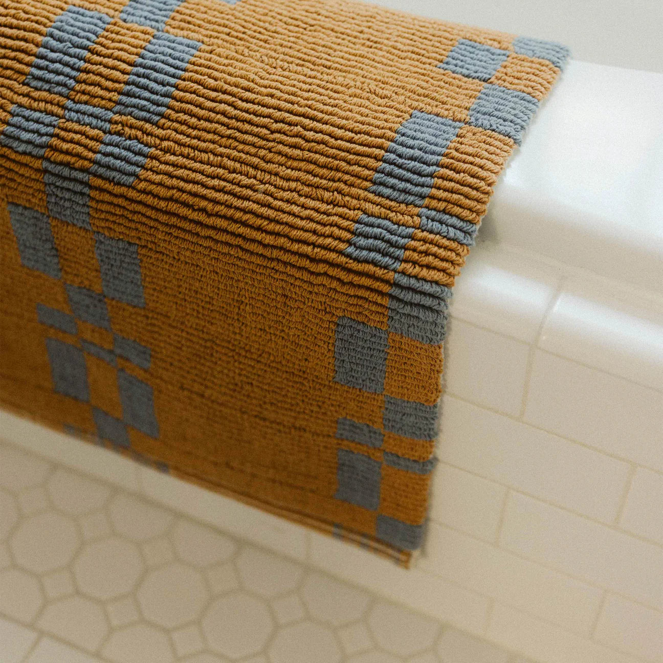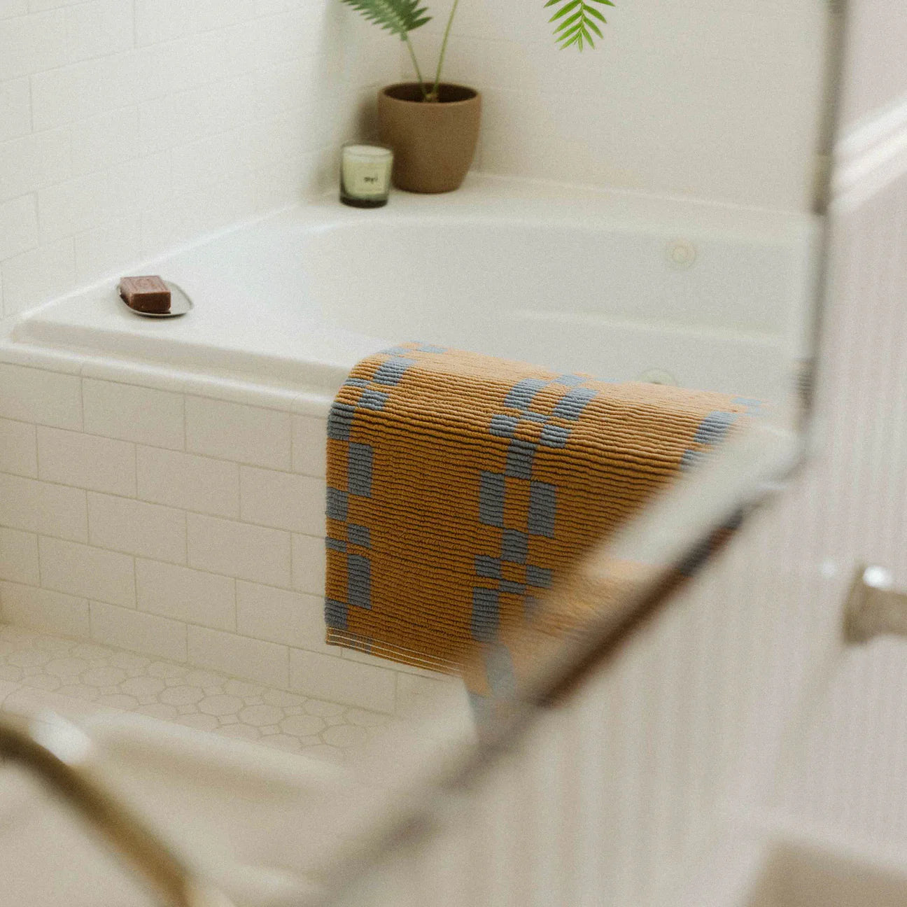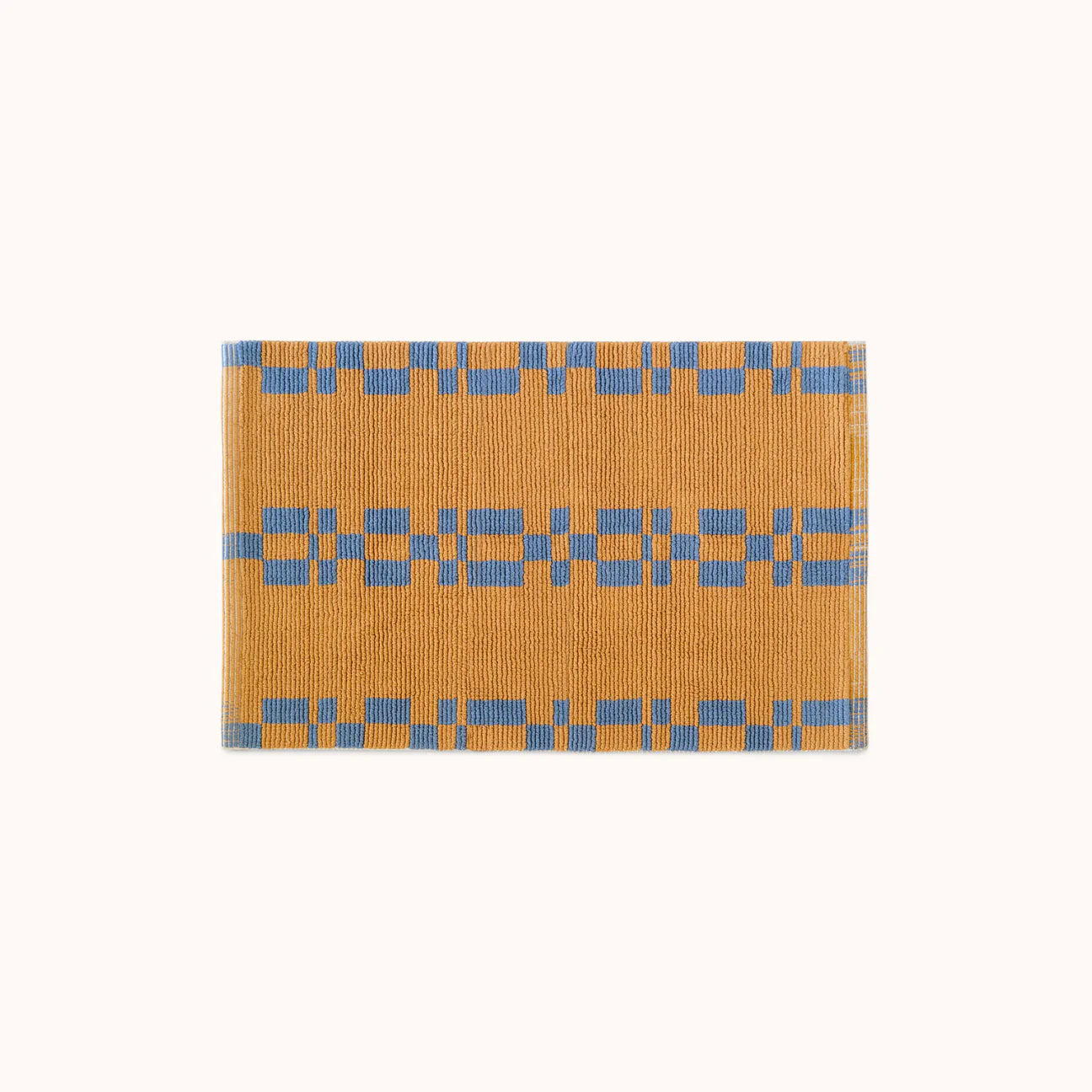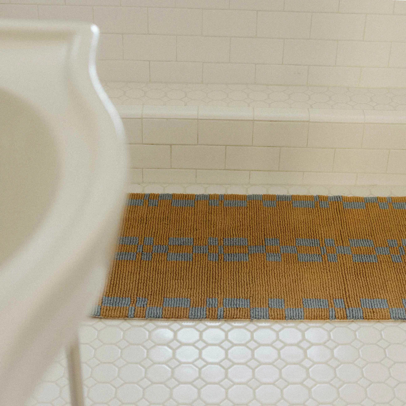The Alina features a smooth surface created by small tight loops. This hand woven style has a geometric pattern on a neutral background, and is perfect for kitchens and bathrooms.