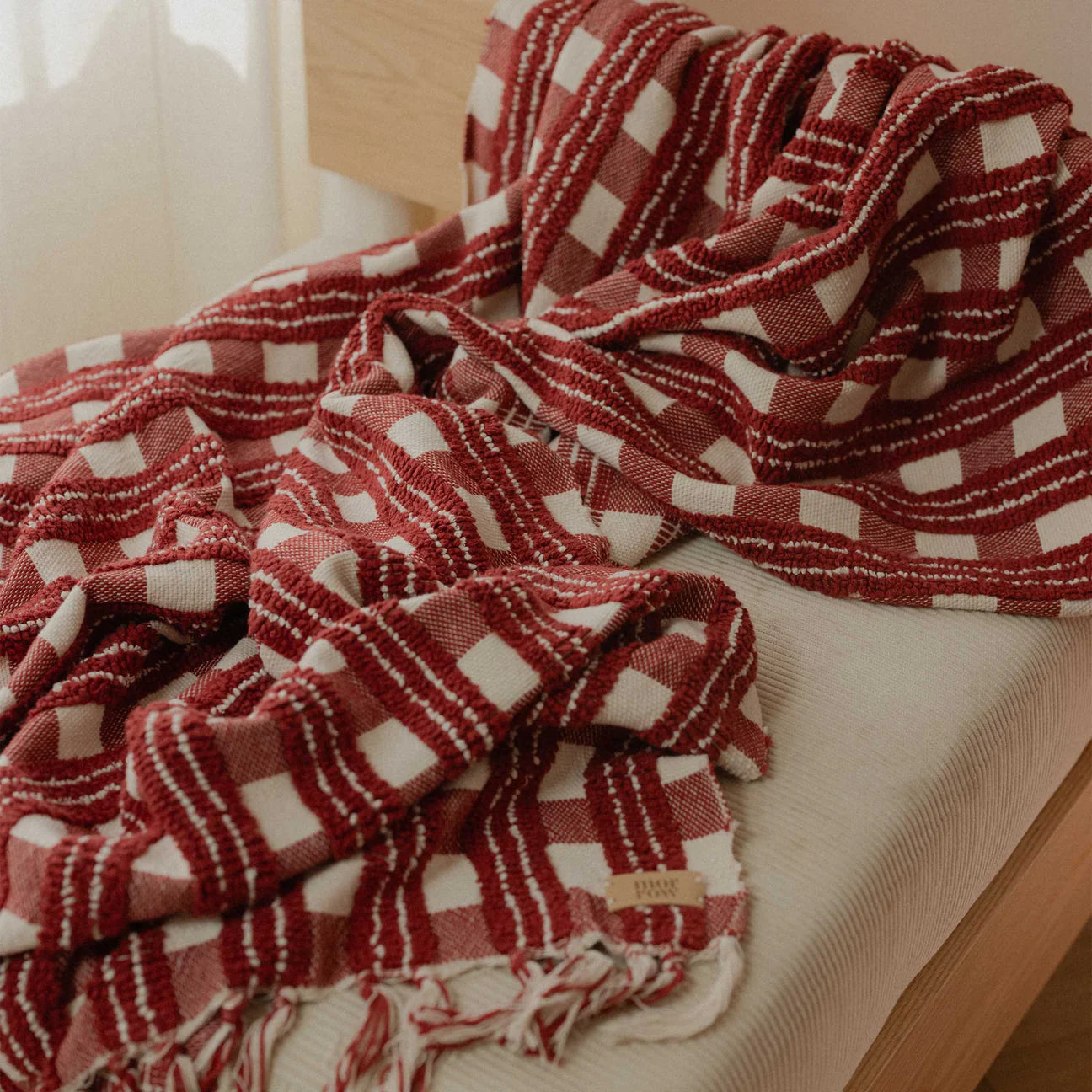 The Camila Blanket is a beautiful, hand woven piece featuring a contrast check pattern with intricately woven textural loops. This vibrant red hue is an easy way to bring unexpected color and pattern into any space.