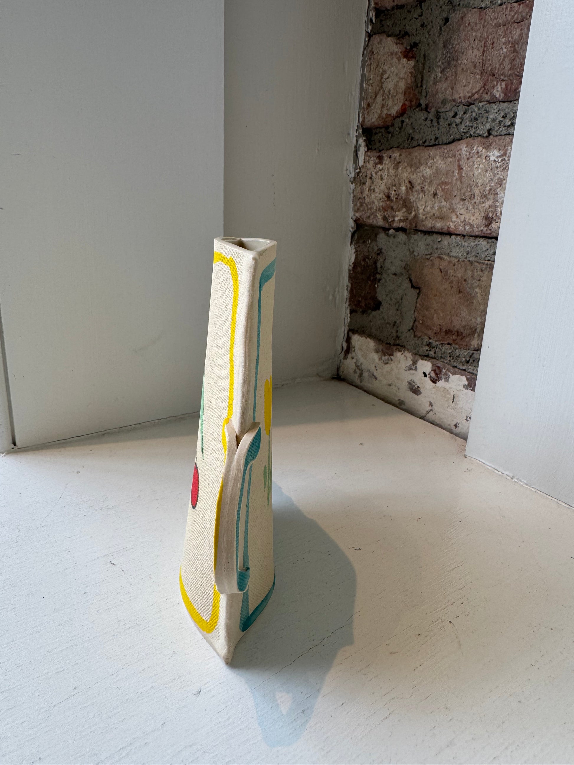 Unique handmade stoneware vase with clear glaze inside and underglaze decoration outside. 5” tall, 5.5” across widest point, 3.5” across base.