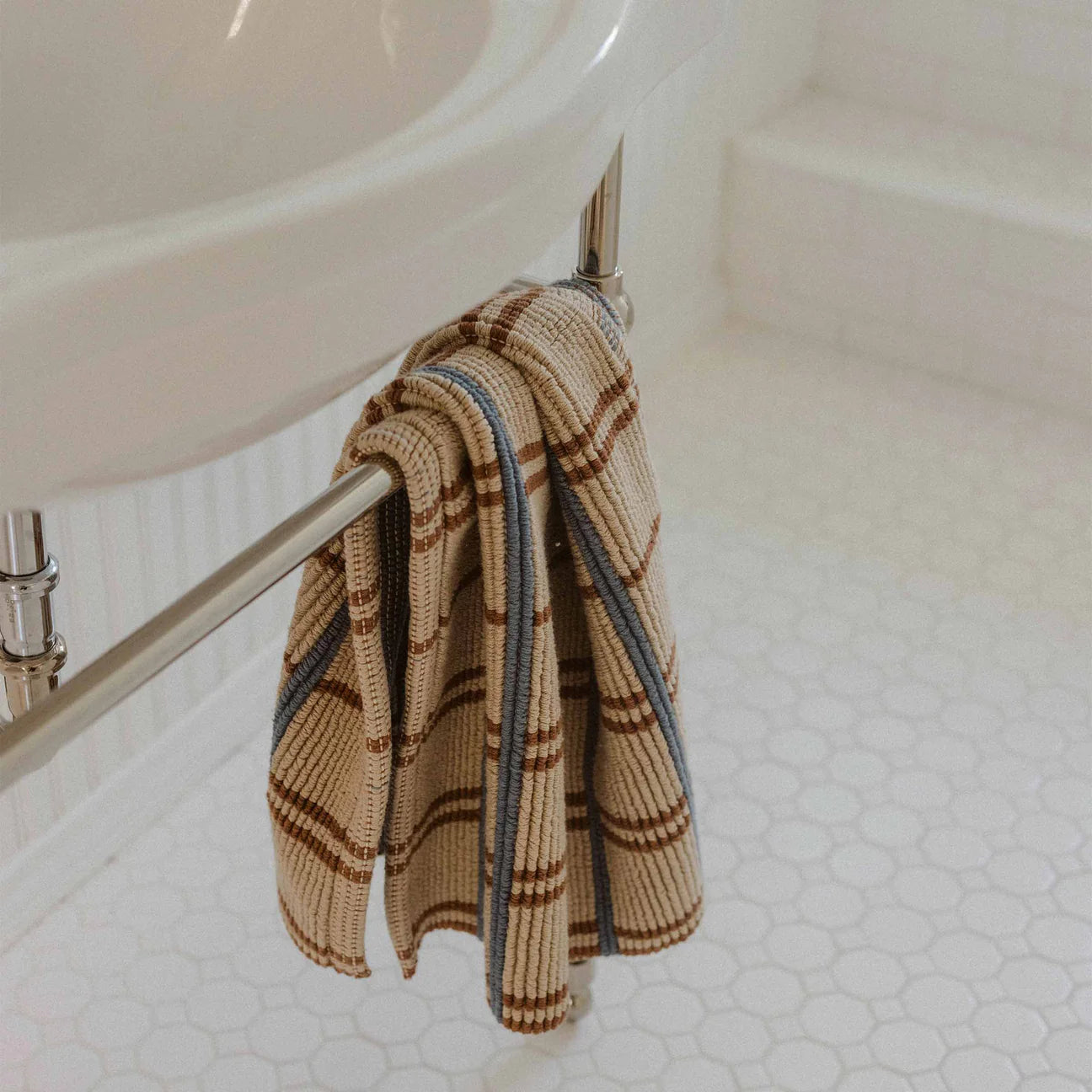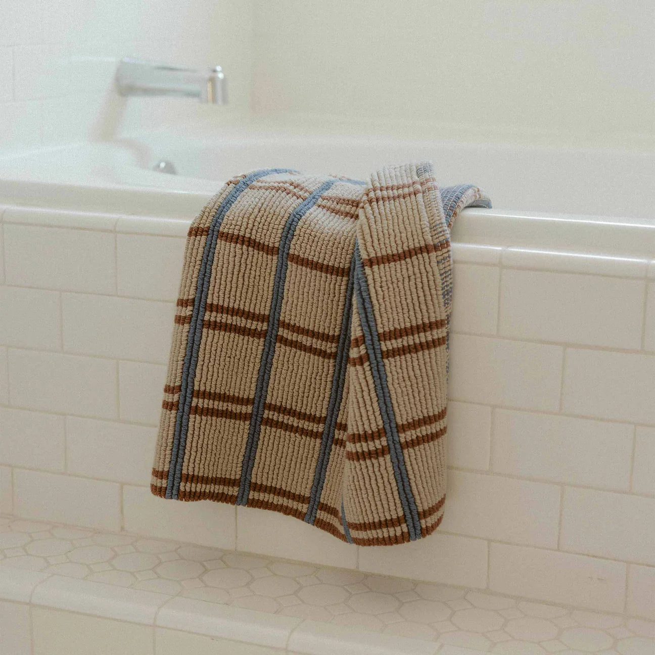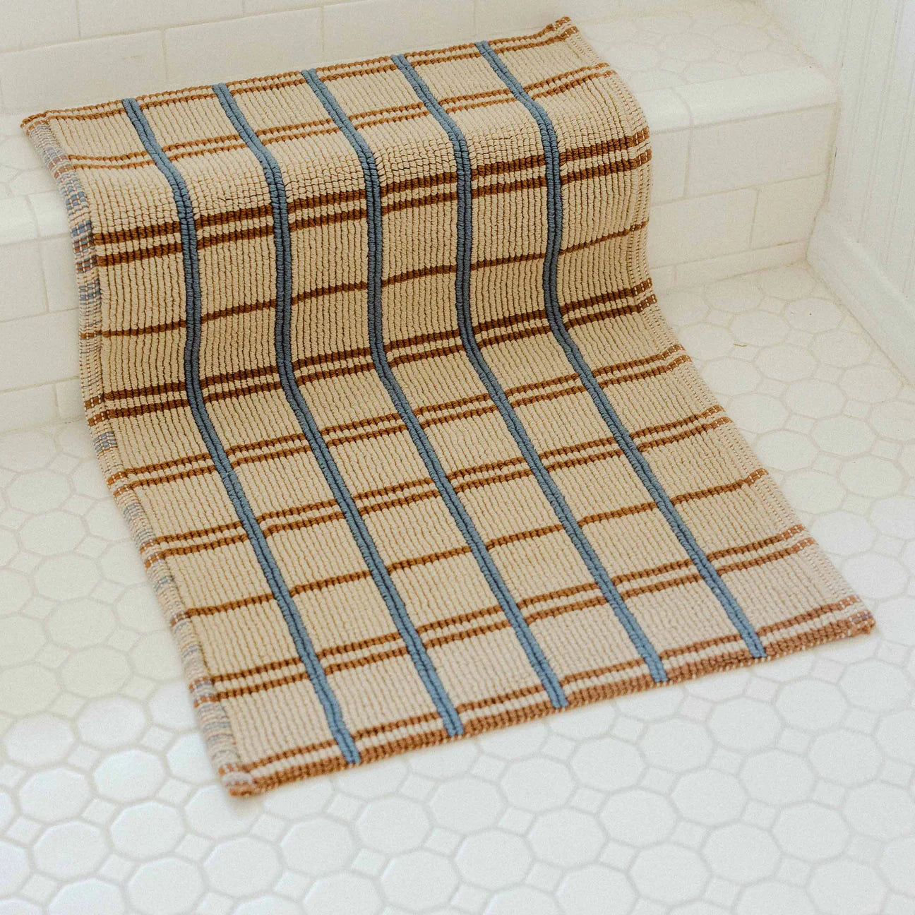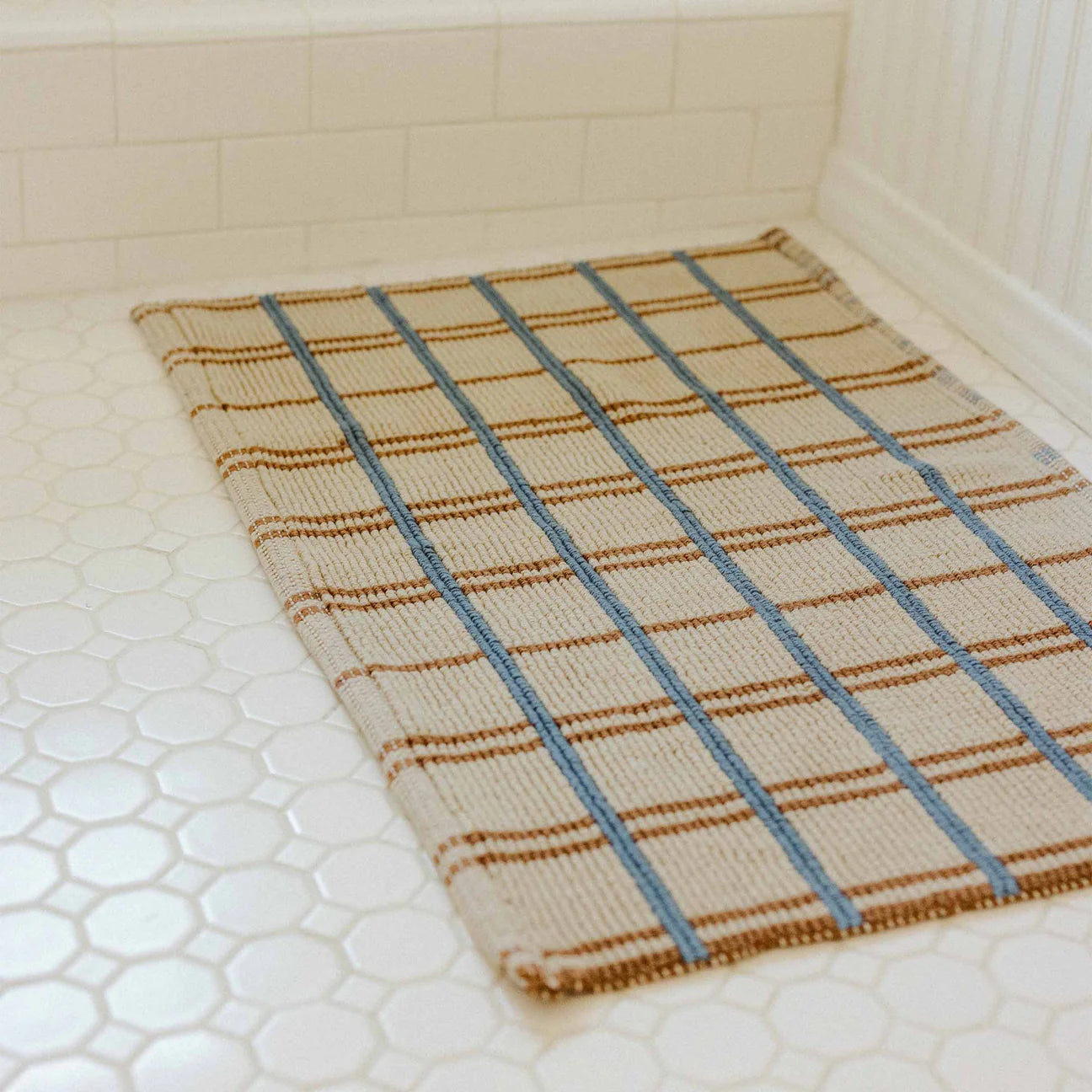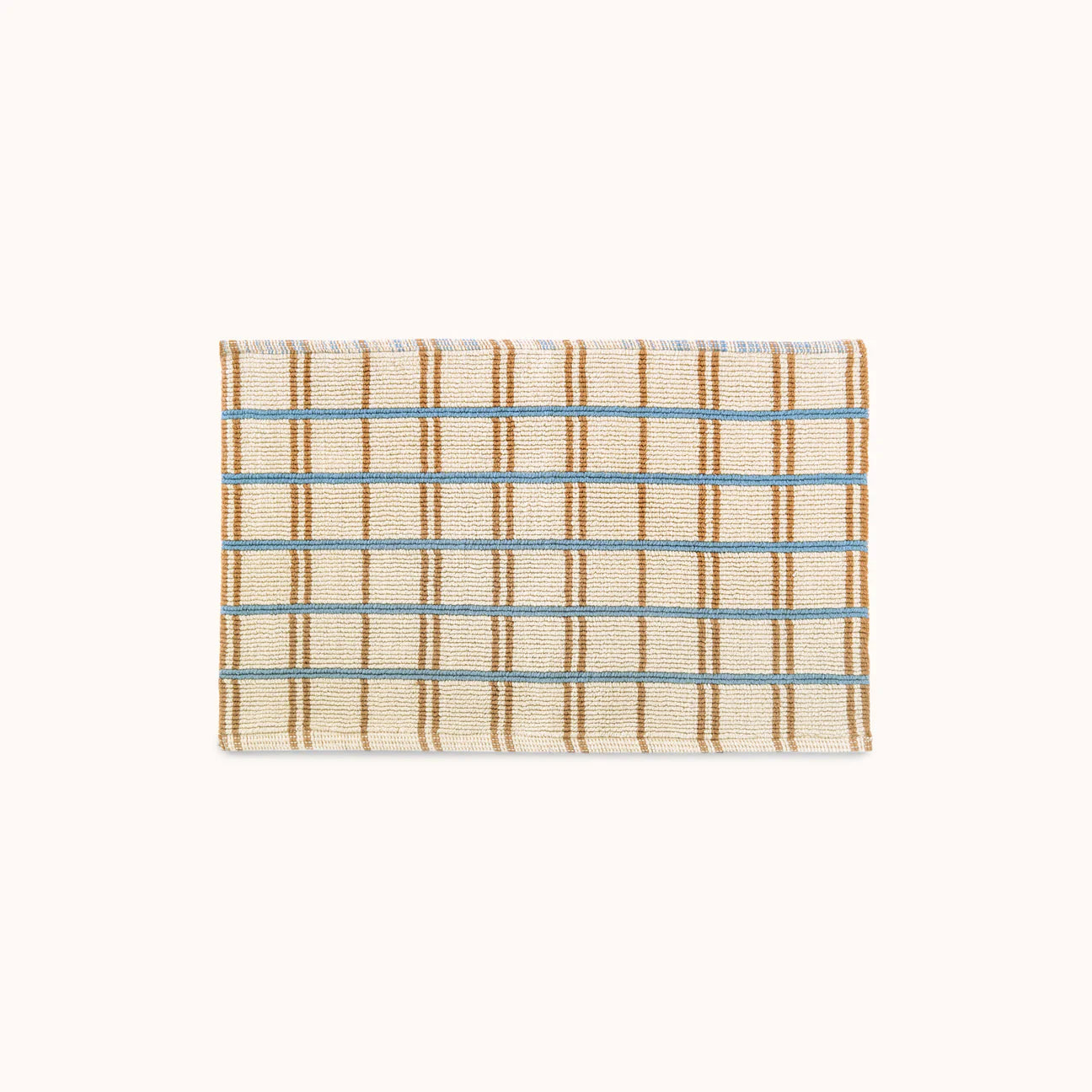 The Lucia features a smooth surface created by small tight loops. This classic check pattern is offered in a beautiful azul and tan colorway on a soft natural background. This washable rug is perfect for kitchens and bathrooms.