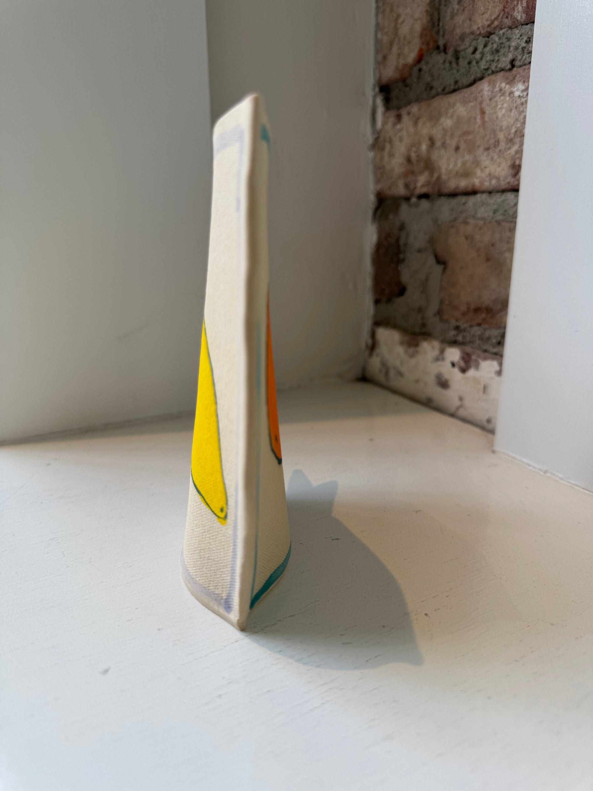 Unique handmade stoneware vase with clear glaze inside and underglaze decoration outside. 5” tall, 4.5” across widest point, 3” across base.