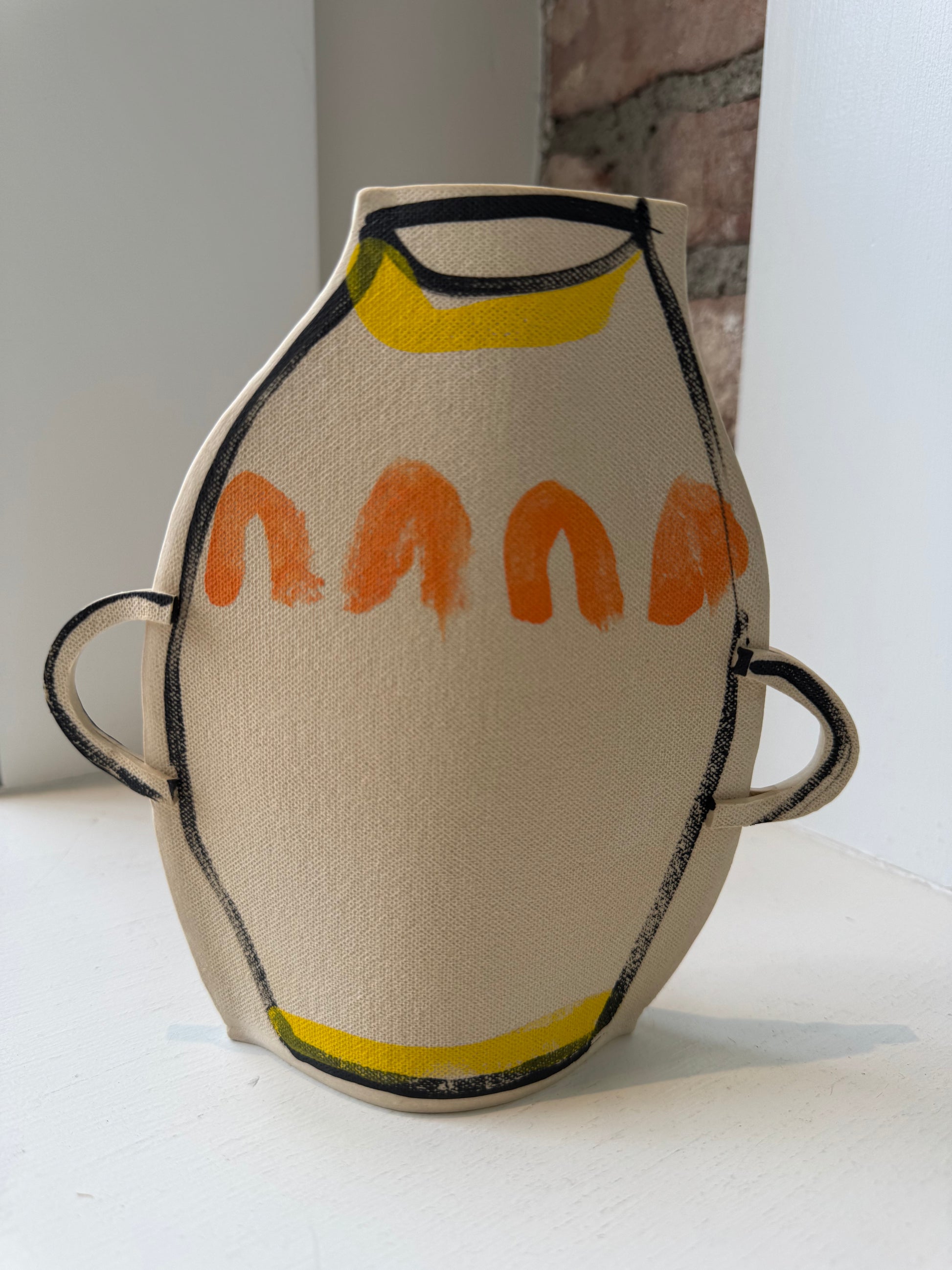 Unique handmade stoneware vase with clear glaze inside and underglaze decoration outside. 6.5” tall, 6.5” across widest point, 3.5” across base.
