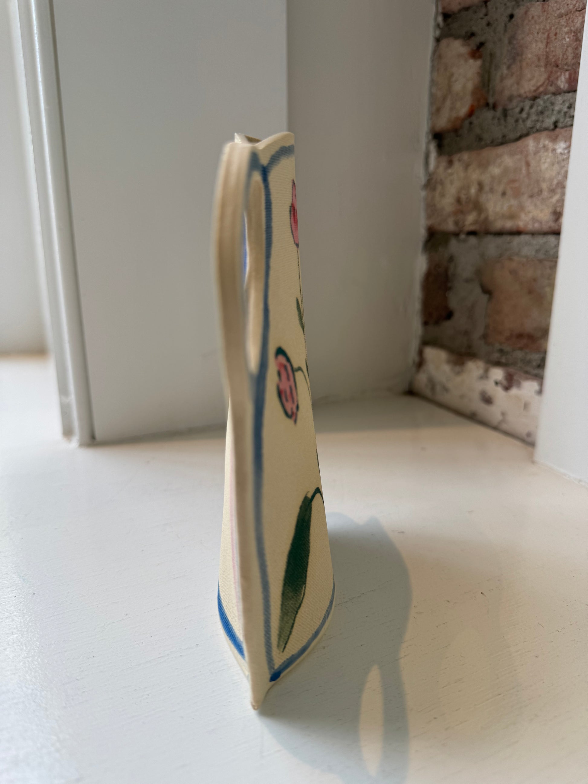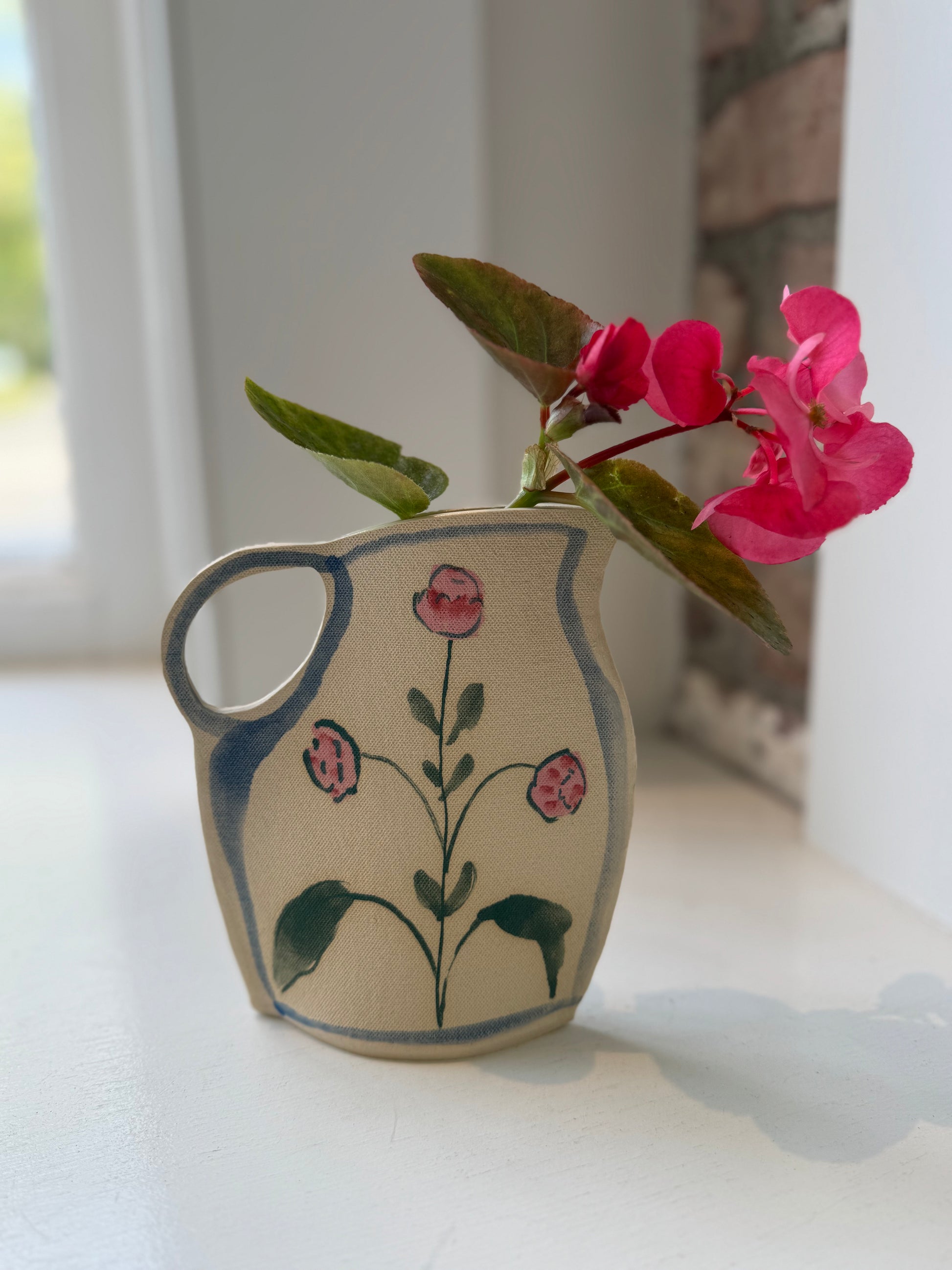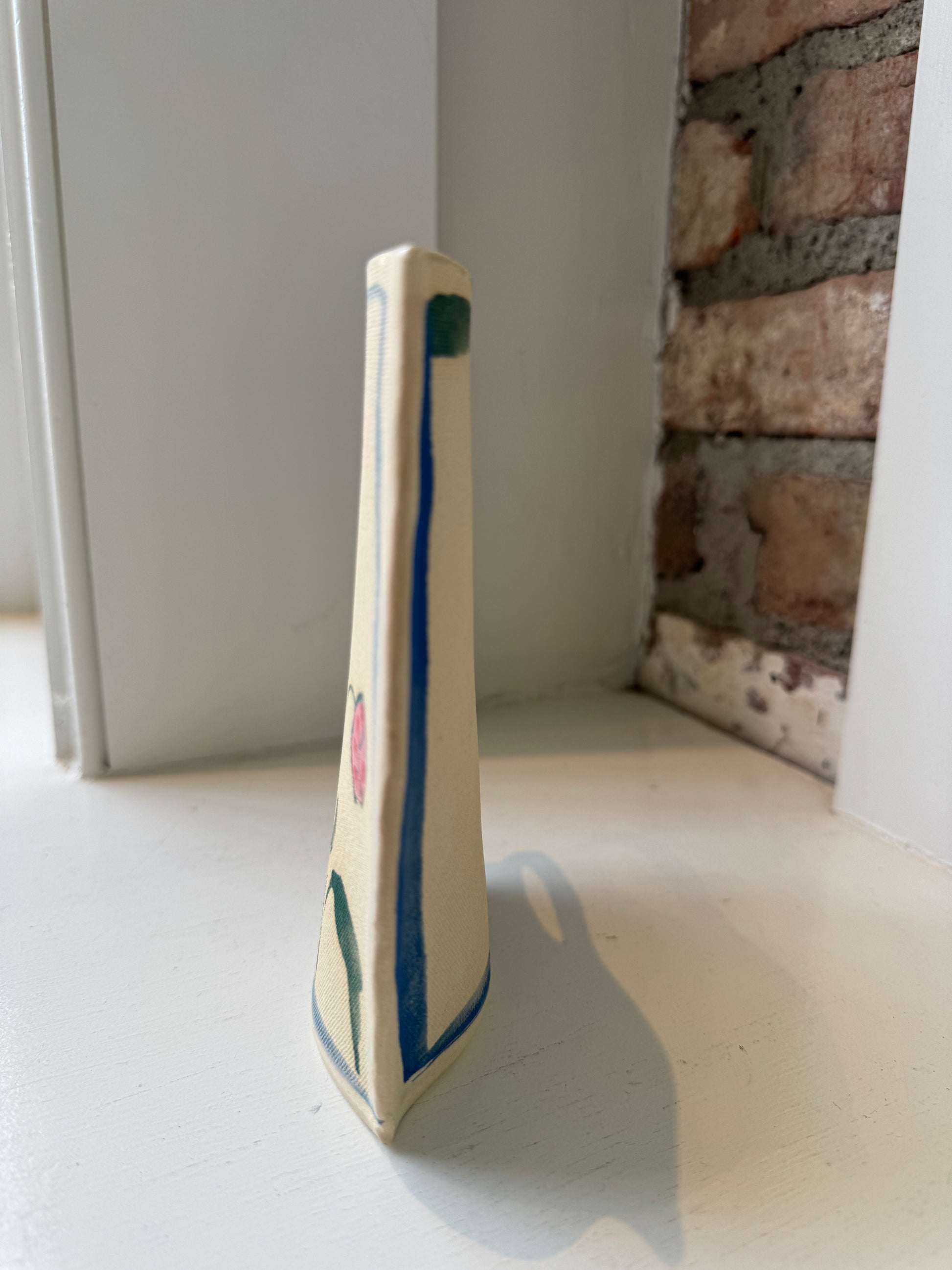 Unique handmade stoneware vase with clear glaze inside and underglaze decoration outside. 6” tall, 5” across widest point, 3.5” across base.