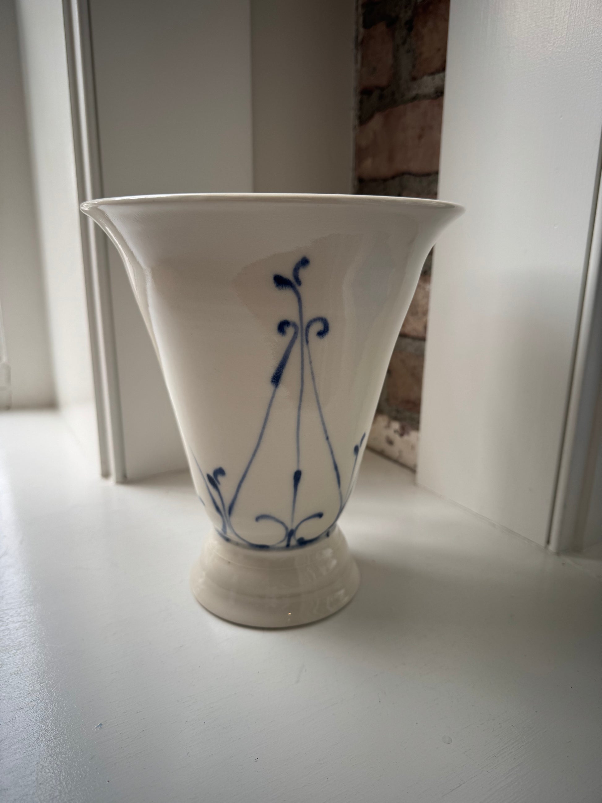 Beautiful one-of-a-kind handmade blue and cream scroll vase by local Hudson Valley ceramist Sentiment Pottery.