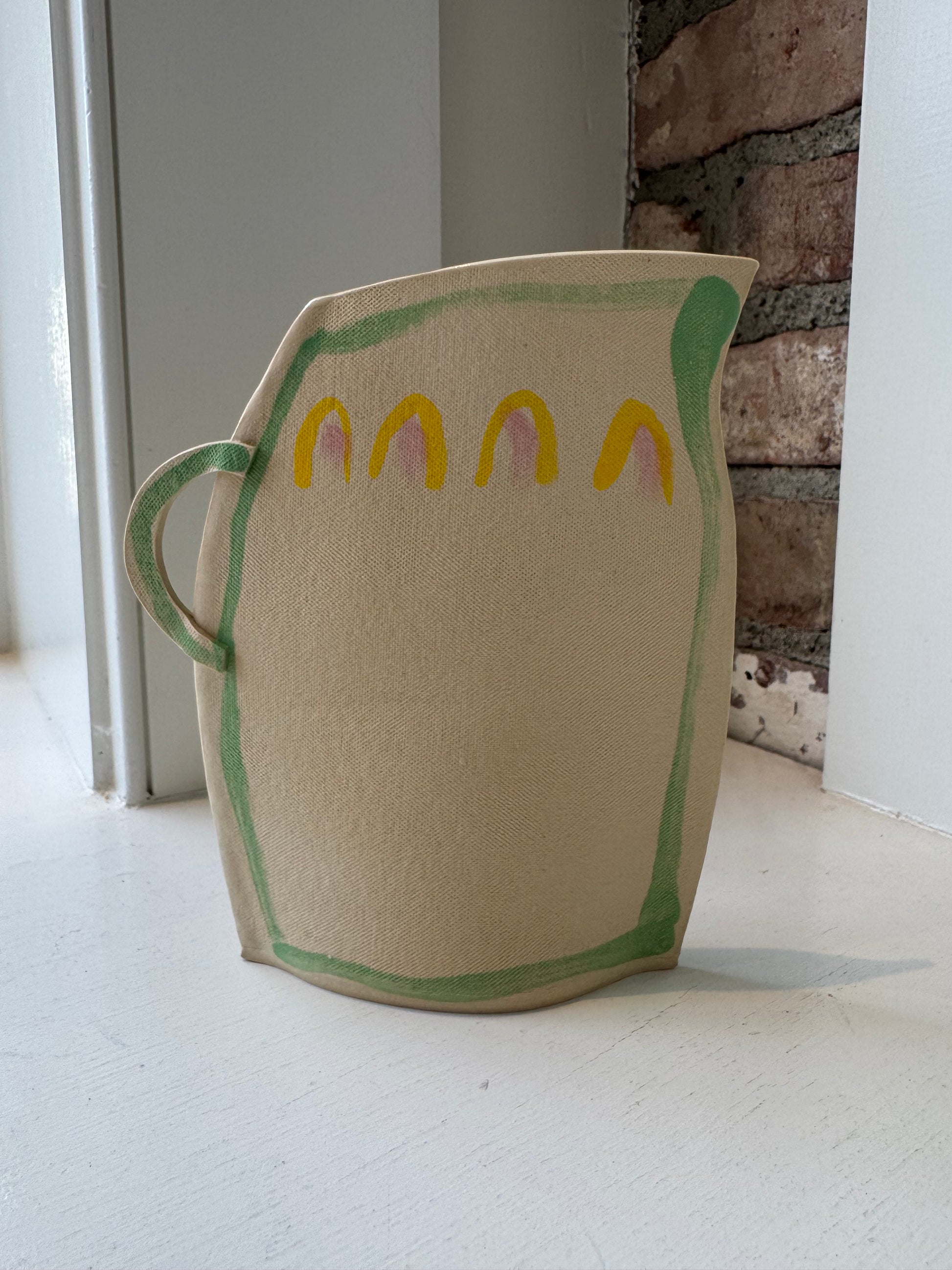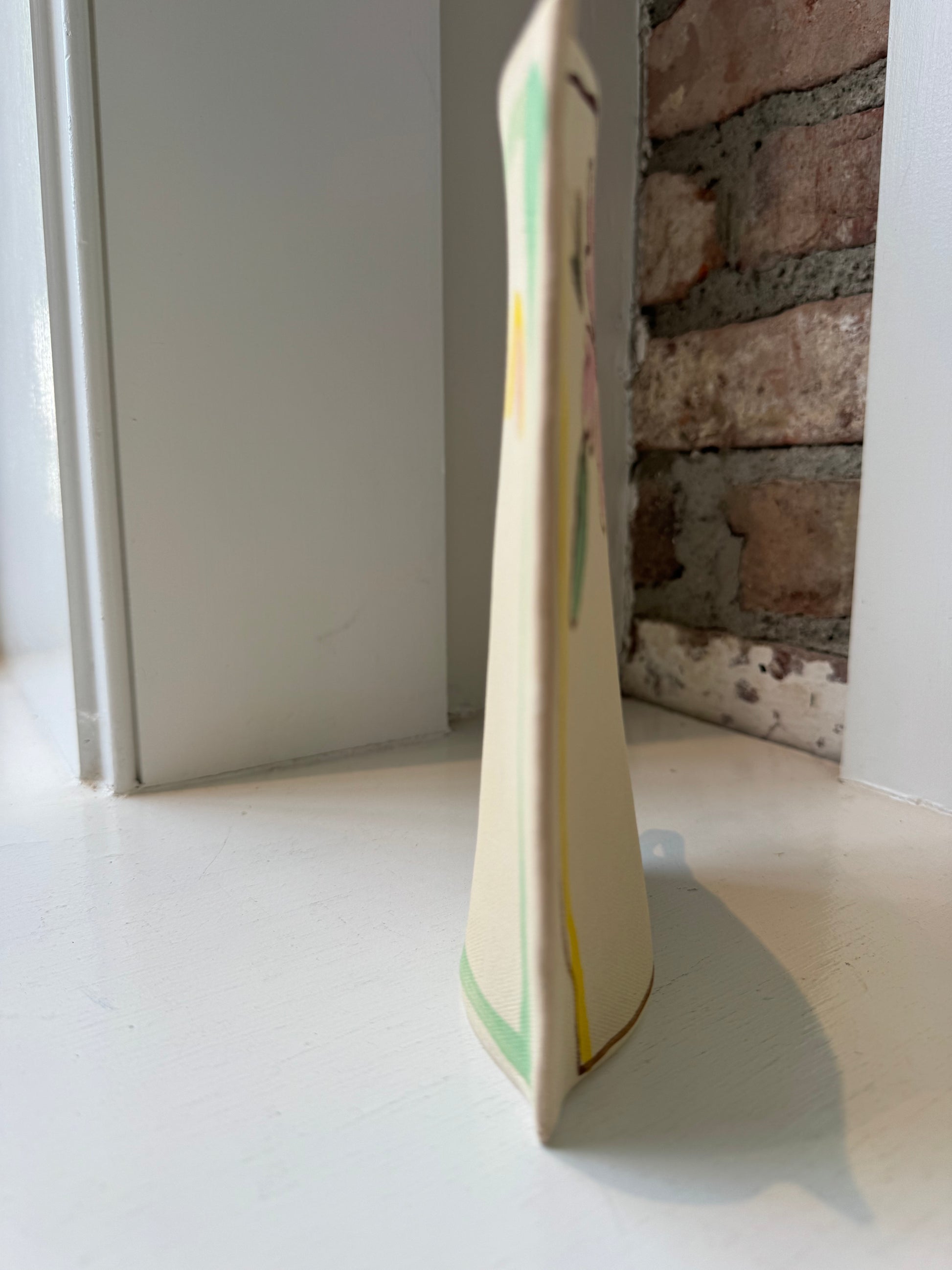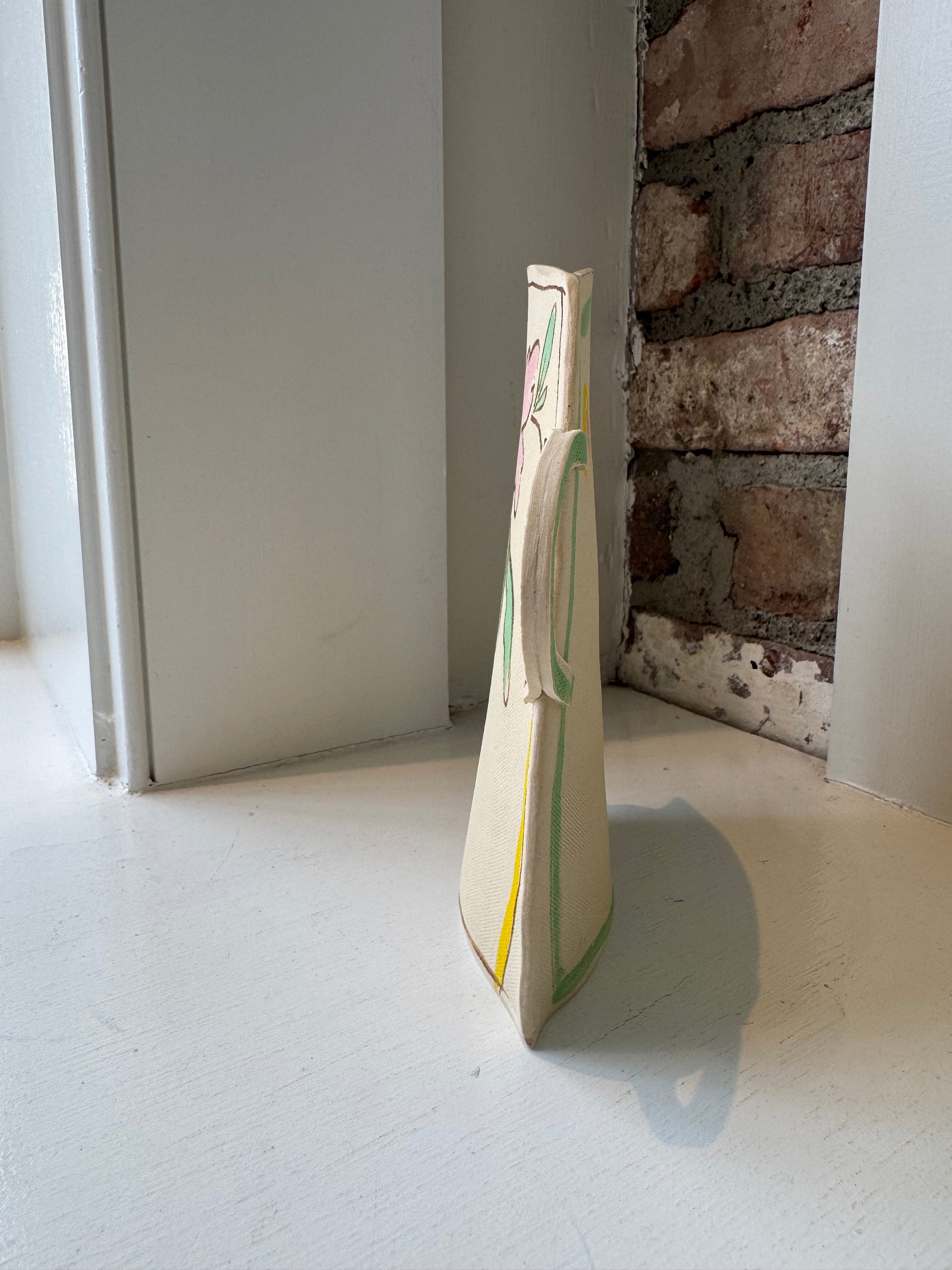 Unique handmade stoneware vase with clear glaze inside and underglaze decoration outside. 7” tall, 6” across widest point, 4.5” across base.