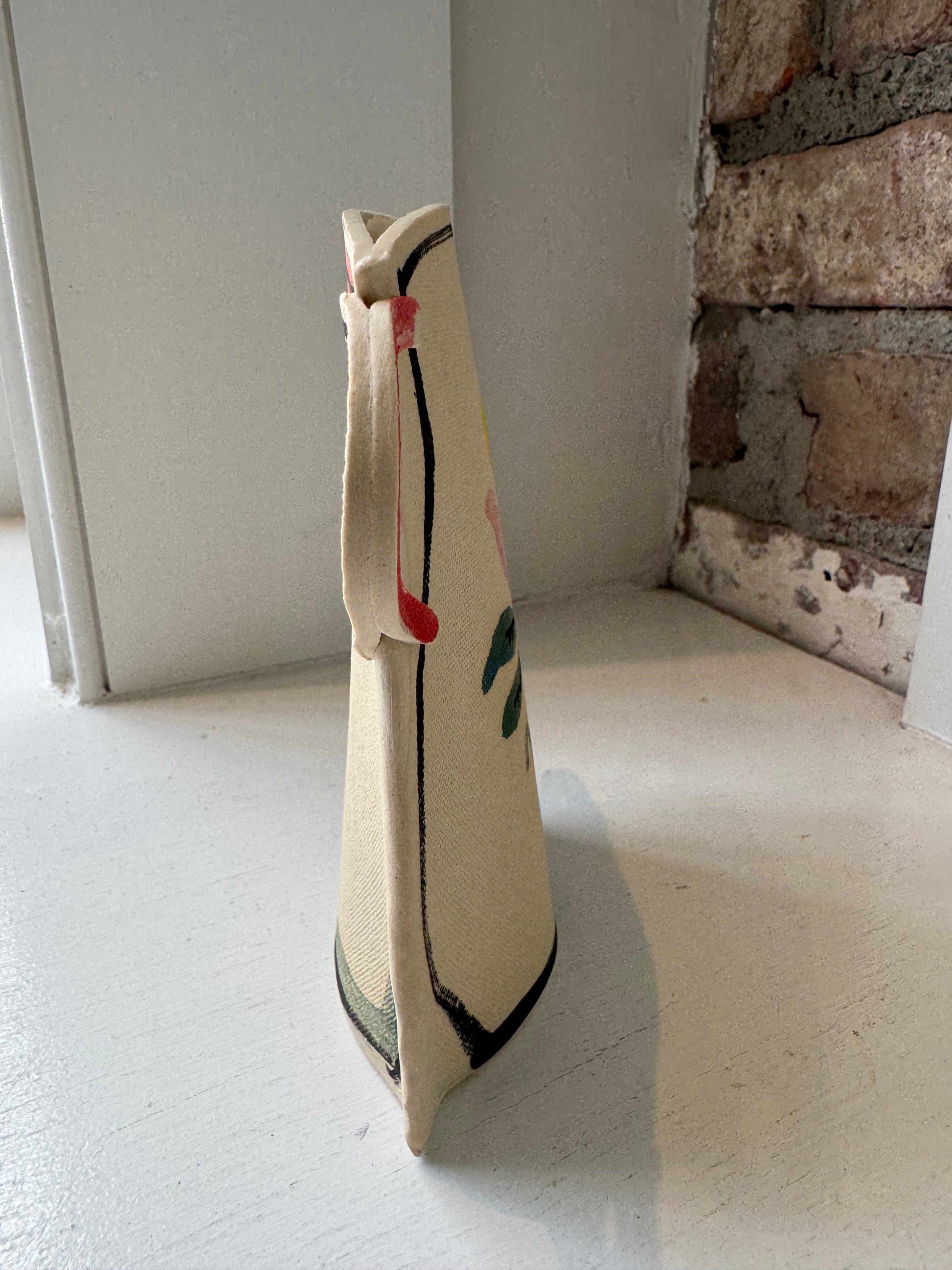 Unique handmade stoneware vase with clear glaze inside and underglaze decoration outside. 5.5” tall, 5” across widest point, 3.5” across base.